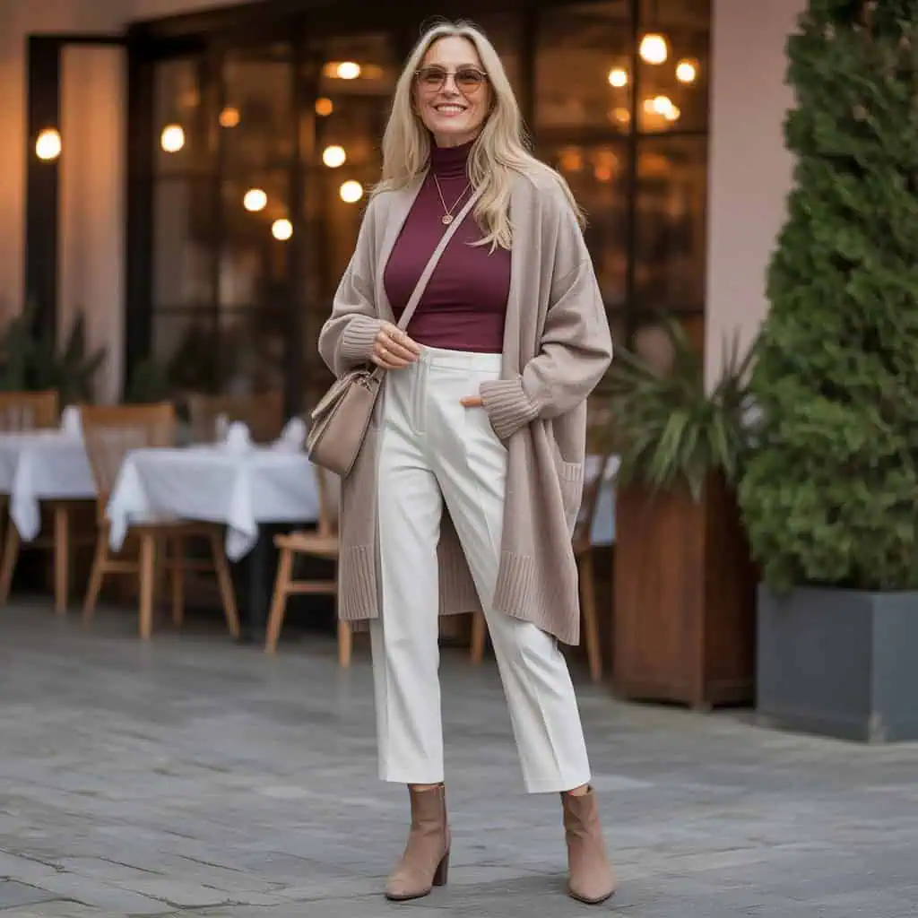 Chic and stylish, ankle boots are the perfect autumn staple that every woman over 50 should embrace. The suede finish elevates the look, while the relaxed beige oversized cardigan worn over a fitted maroon turtleneck creates a harmonious palette that feels effortlessly put-together. The white trousers streamline the silhouette and keep the outfit grounded. Ankle boots add a touch of edge but remain practical for navigating through the sometimes unpredictable autumn weather. This look perfectly merges comfort with chic aesthetics, making it ideal for daily errands or evening gatherings. With gold hoops and a crossbody bag as accessories, it’s a fully realized ensemble that stands out without overpowering.