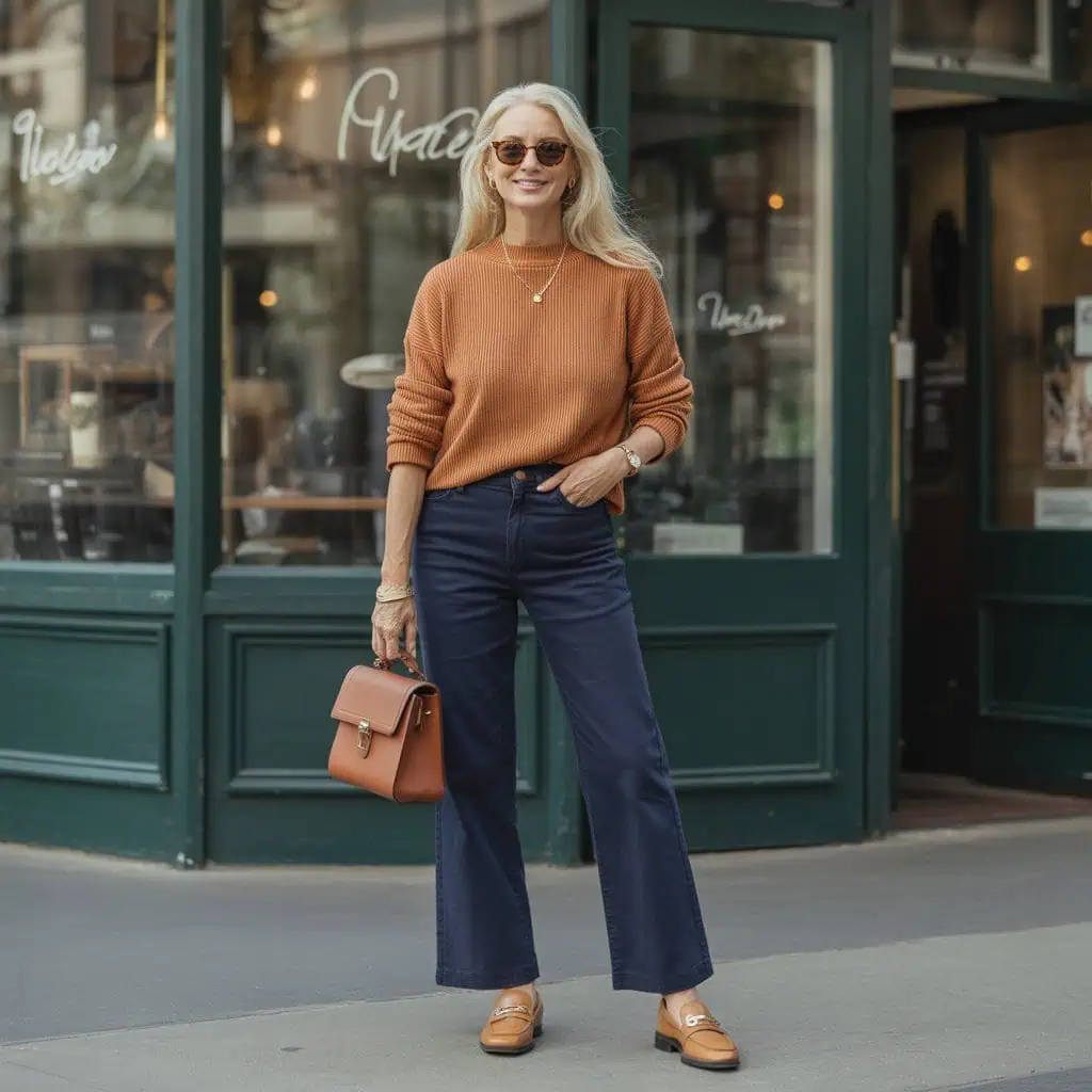 Embracing the cozy vibe of autumn is effortless with a chic knit sweater. The softness of fabric combined with its inviting aesthetic makes it an ideal go-to for both warmth and style. A cream knit adds a touch of elegance, versatile enough to transition from day to night. Pairing it with straight navy trousers not only balances the colors but also lends an elongated look. For a playful touch, consider incorporating a silk scarf; it adds flair and personality without overwhelming the outfit. Accessorized simply with stud earrings and ballet flats, this combination is perfect for casual outings or meeting friends for coffee. The key is to feel comfortable while looking effortlessly chic!