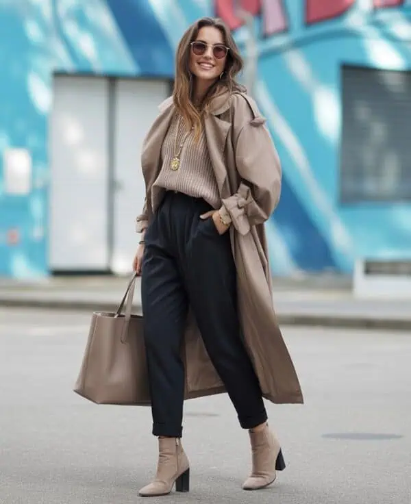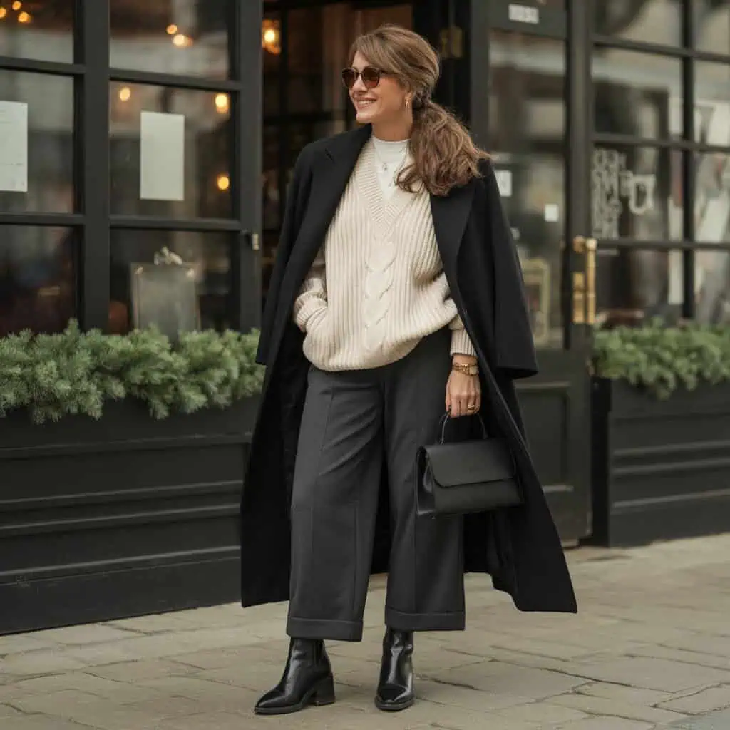 When it comes to comfort without sacrificing style, a heavy cardigan paired with lined trousers does the trick. The oversized cardigan, when layered over a fitted white shirt, brings a sense of effortless cool that’s still polished. Choosing charcoal lined trousers plays off the darker hues in the cardigan while providing a tailored finish. This combination creates an enviable silhouette that flatters the body without clinging too tightly. Dark brown ankle boots add a bit of grounding weight to the outfit, while accessories like gold studs and a coordinating handbag tie everything together for a chic, day-to-night look.