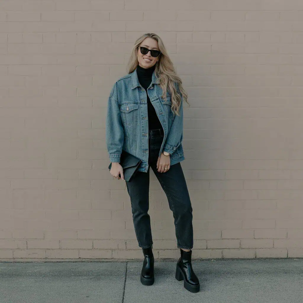 When it comes to heavy denim, the key is balancing proportions to create a chic silhouette. The oversized denim jacket provides a cozy and relaxed vibe, while the fitted turtleneck draws attention to the waist, giving you shape amidst the bulk. Denim pants are sturdy without feeling heavy, and they work beautifully with chunky platform ankle boots, which add height and edge. The contrast of textures and shapes is vital—opting for a simple black clutch keeps the look polished without overwhelming it. Minimal jewelry allows the outfit’s textures to shine, while oversized sunglasses complete the effortlessly stylish aesthetic.