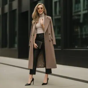 When navigating the delicate balance of heavy fabrics, wool trousers can provide a luxurious feel without overwhelming your frame. Tailored grey trousers contribute to a fluid silhouette, particularly when teamed with a fitted top. By tucking in a black turtleneck, you define your waist and keep the focus on your upper body, allowing the trousers to drape beautifully without feeling bulky. Flat-soled block heels seamlessly merge comfort and elegance, keeping the look grounded yet polished. Accessories like a sleek clutch and minimal jewelry help to ace sophistication while allowing the wool pieces to stand out without the outfit feeling overly heavy or cluttered.