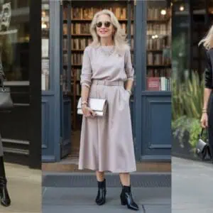 Flat-front slacks are an essential addition to any woman’s wardrobe, especially for those over 50. They create a sleek silhouette that elongates the legs and offers a polished appearance without being overly formal. The choice of taupe in the trousers allows for a versatile base that can effortlessly transition from day to night. Pairing them with a slightly tucked brown blouse adds a touch of sophistication and definition to the waist, while cognac boots bring warmth and texture, harmonizing beautifully with the ensemble. Refined accessories, like a taupe handbag and stylish sunglasses, enhance the chic vibe, ensuring you look effortlessly put together whether you’re at a brunch or a casual meeting.