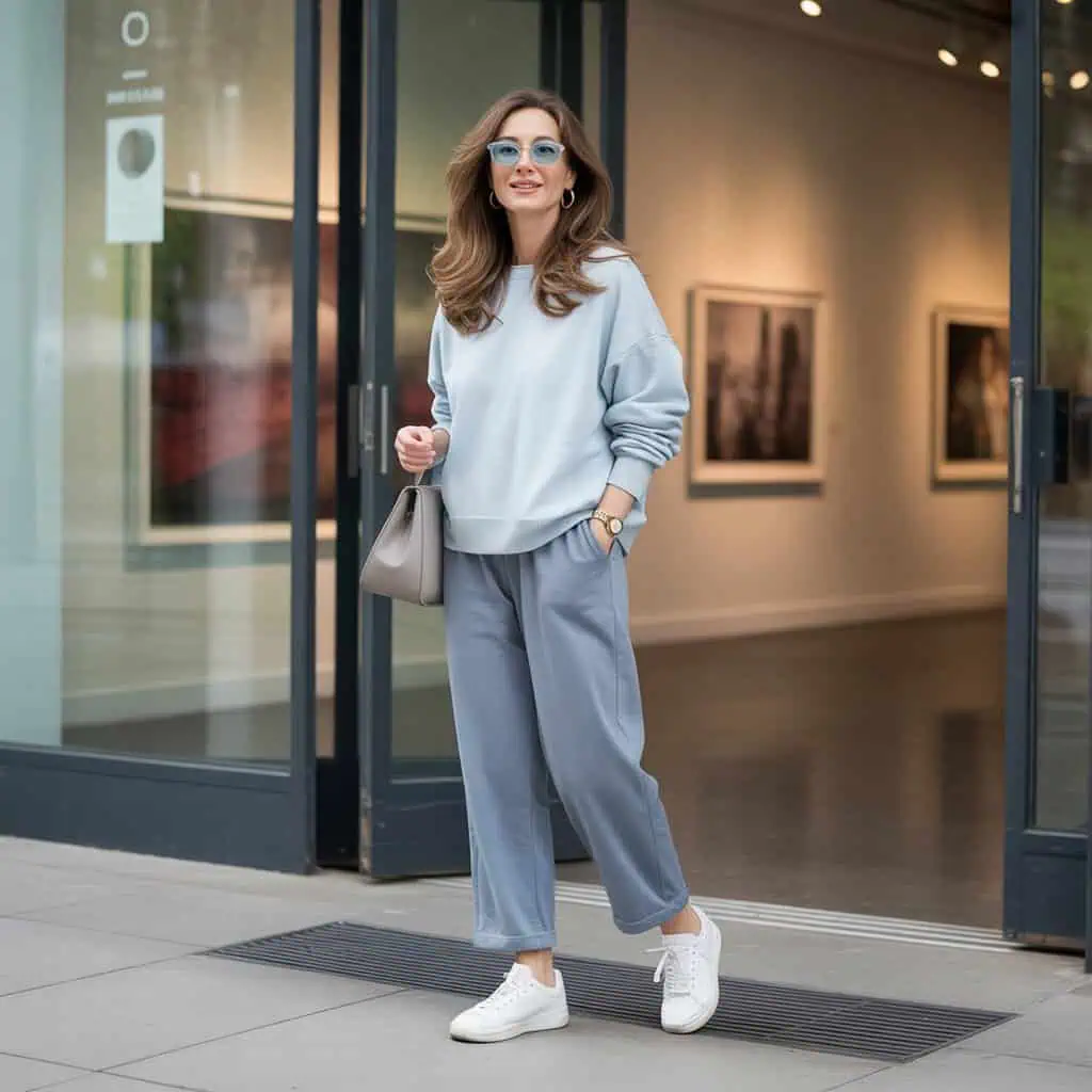 Ponte trousers are a game-changer for those seeking both comfort and style, particularly in the over-50 demographic. The soft stretch fabric not only provides a flattering fit but also ensures ease of movement—a perfect match for a busy lifestyle. Pairing these gray trousers with a light blue oversized sweater yields a relaxed but pulled-together vibe. This color combination is fresh and refreshing, ideal for both casual outings and more formal settings. Completing the look with white sneakers creates a trendy, athleisure-inspired ensemble that feels both youthful and chic. The small gold hoops and pale blue-tinted sunglasses add just the right amount of polish, making this outfit a favorite for gallery strolls or weekend brunches with friends.