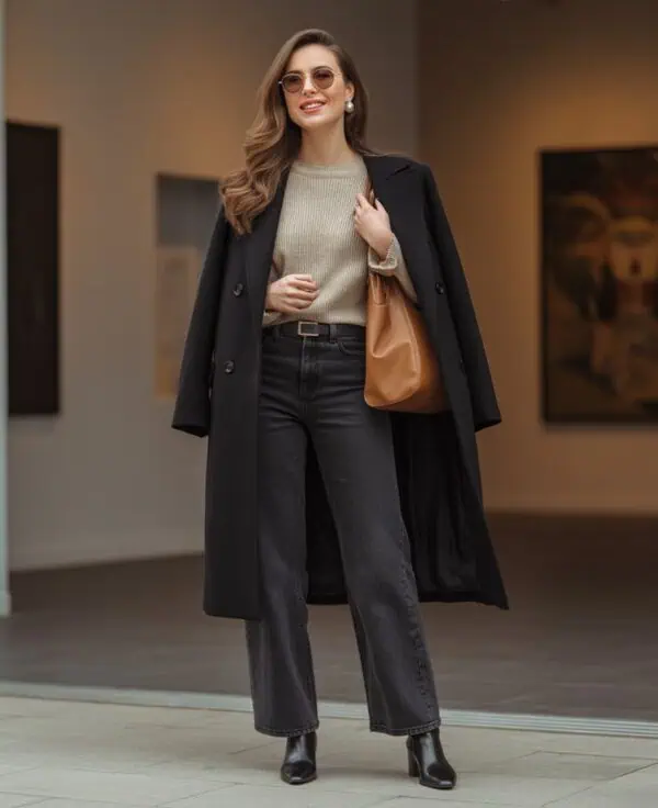 Layering is an art, and this combo makes it look effortless. A cozy cream cardigan layered over a classic black turtleneck is incredibly inviting, bringing warmth without sacrificing style. The wide-leg trousers add drama and movement to the outfit, balancing the fitted layers on top. Play with proportions here, as the open cardigan creates a flowing silhouette that’s both comfortable and chic. White kitten heels inject a dash of elegance without compromising comfort, perfect for long days. A structured taupe bag and soft gold accessories lend just the right amount of polish, making this look appropriate for work, brunch, or an art exhibition—wherever you’re headed!