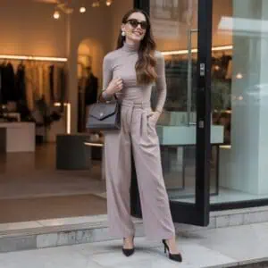 This combination effortlessly showcases the beauty of minimalism while underscoring the importance of texture and fit. The fitted turtleneck provides a sleek silhouette that highlights the waist, creating an elegant hourglass shape, which is crucial for a polished look. Pairing it with tailored wool trousers brings in an element of sophistication—think structured but comfy. The muted tones of taupe and grey evoke a sense of calm and refinement, while the accessories, like the structured handbag and delicate gold studs, add a touch of understated luxury. This ensemble is ideal for transitioning from daytime outings to evening gatherings, easily adaptable to your mood.