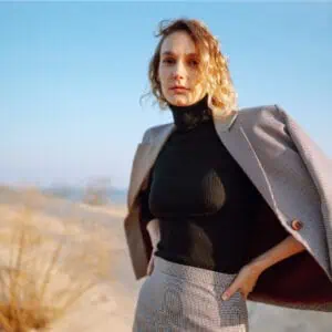 There’s something effortlessly chic about a statement wool coat layered over timeless basics. The oversized plaid coat here not only acts as a focal point but also adds texture and personality to an otherwise straightforward outfit. The fitted black turtleneck and high-waisted beige trousers establish a sleek foundation, allowing the bold coat to shine. This combination masterfully balances sophistication with a touch of casual flair, making it versatile for both leisurely outings and more polished settings. The chic black leather ankle boots elevate the look, while accessories like oversized sunglasses and gold hoops add a hint of glamour, proving that a striking coat can indeed do all the heavy lifting.