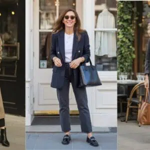 A matching knit set layered under a long coat is the epitome of cozy-chic elegance. The fitted sweater and wide-leg pants offer a relaxed yet refined aesthetic, perfect for showcasing your style while allowing for comfortable movement. Knits provide warmth, making them an excellent option for transitional seasons. Adding a long coat not only adds drama but also tackles any chill in the air with flair. The loafers keep the look grounded and easygoing, while statement earrings introduce a pop of personality. With structured tote and geometric sunglasses in tow, this outfit strikes an effortlessly modern note, showing that grown-up style can be fun and sophisticated.