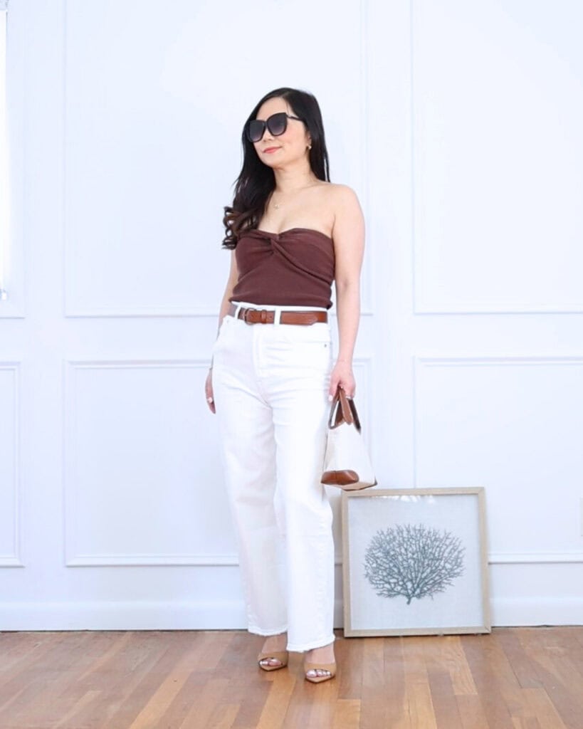 To keep things chic, I’ll wear them with a monochromatic top and jacket in a soft neutral like taupe or beige. It creates a long, unbroken line that’s especially flattering if you’re petite. A classic brown leather belt defines the waist and adds just the right amount of structure. This look feels grown-up and polished, and it’s one I reach for on days when I want something effortlessly refined.