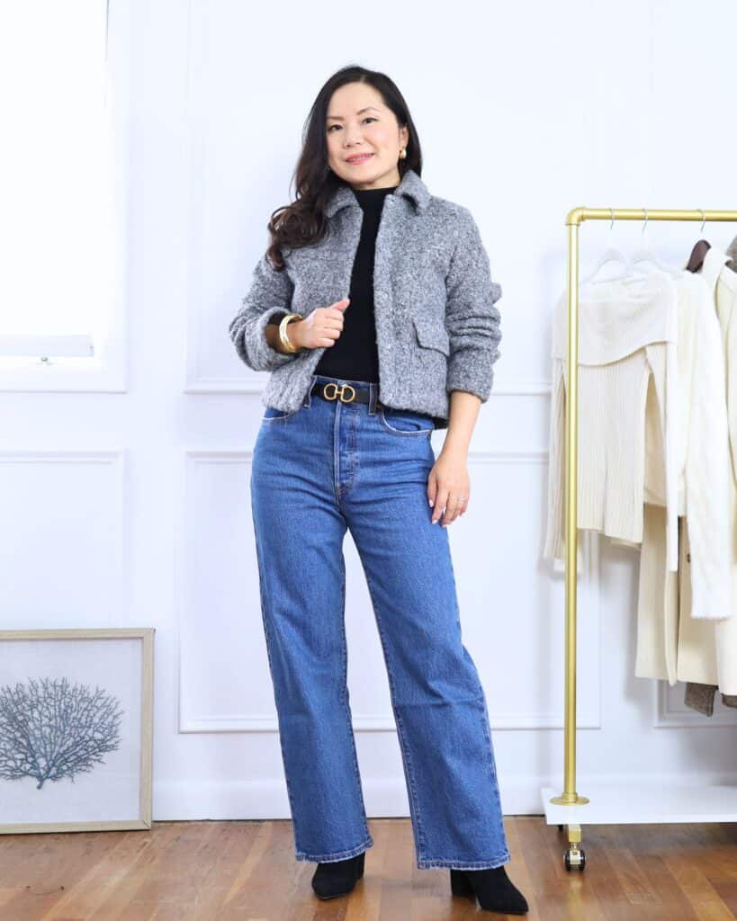 One of my go-to combos is a fitted black turtleneck tucked into my high-rise jeans, topped with a cropped jacket. The short jacket hits right at the waist, helping to visually lengthen the legs. I’ll add a pair of sleek ankle boots to keep things streamlined. This outfit is a favorite when I want to feel a little more pulled together for errands, meetings, or casual days where I still want to look like I made an effort.