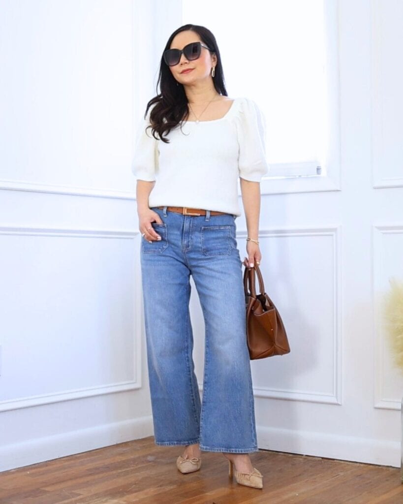 I love pairing mine with a puff sleeve square-neck top—it adds a touch of femininity and brings structure to balance out the volume on the bottom. I always reach for pointed-toe heels with wide-leg jeans, especially as someone who’s 5’2″—they help elongate the leg line and add a little extra polish. This combo is perfect for date nights or weekend brunches when I want to feel a little elevated without being overdone.