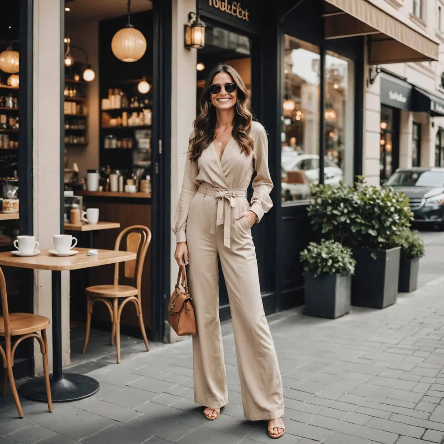 The long sleeve jumpsuit is the perfect piece for spring and summer. The neutral color makes the outfit look effortless, while the one-piece design makes you look taller and leaner.