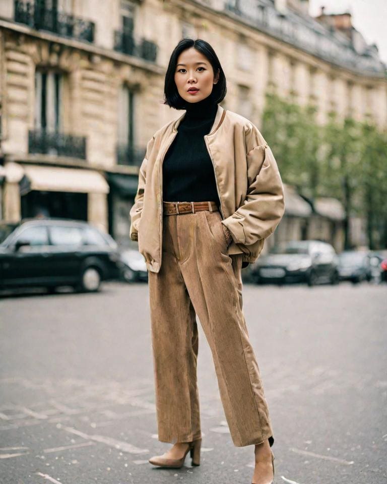 Corduroy pants have that distinct vintage charm that makes them a stylish choice for a cozy casual date with your sweetheart. Pairing them with a sleek black turtleneck top adds sophistication, while an edgy bomber jacket should give you that elevated modernity.
