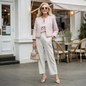 Consider embracing elegant boatneck shells instead of cold-shoulder tops for a trend that combines femininity with timeless sophistication. The boatneck style beautifully frames the shoulders and collarbone, offering a polished, graceful appearance. In a soft powder blue, this top pairs seamlessly with white wide-leg trousers for a fresh contrast that feels both breezy and refined. Ballet flats ensure ease of movement while maintaining a stylish edge. Simple yet striking accessories like oversized sunglasses and delicate bracelets complete the outfit, capturing the essence of effortless elegance that is perfect for everything from brunch to casual outings.