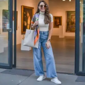 Combining dark indigo high-waisted wide-leg trousers with a crisp white poplin shirt creates a timelessly chic look that’s effortlessly sophisticated. The airy nature of the white poplin adds a fresh contrast to the deep indigo, while the wide-leg silhouette exudes a relaxed yet polished vibe. This pairing achieves balance—incorporating structure through the trousers while maintaining a breezy feel with the shirt. Casual white sneakers keep the outfit grounded and youthful, making it perfect for daytime outings or smart-casual occasions, effortlessly bridging the gap between comfort and style.
