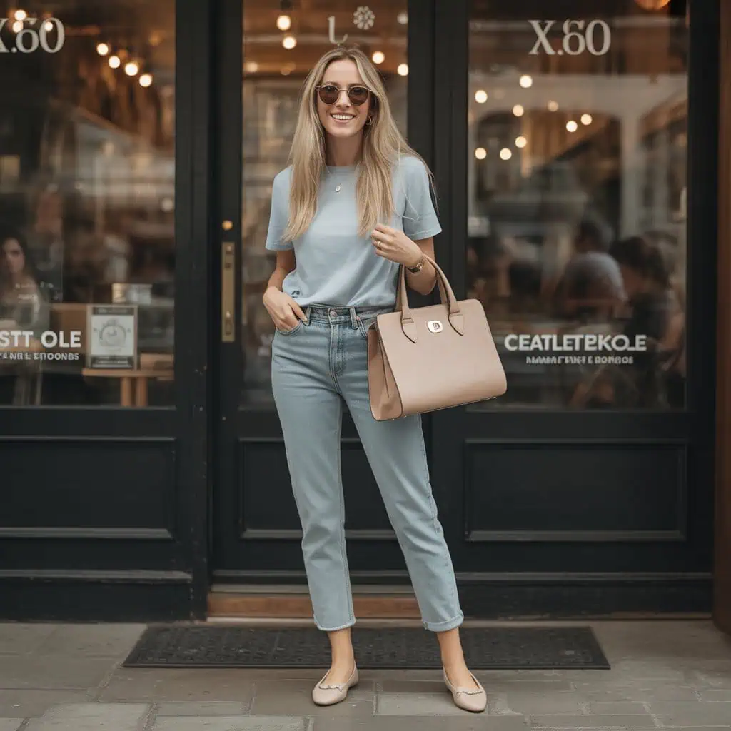 Slim relaxed jeans are your go-to for mastering the art of comfort chic. When combined with a light blue t-shirt that’s gently tucked, this pairing not only flatters your figure but also adds a lively pop of color that’s easy on the eyes. The clean lines of ballet flats contribute a touch of refinement, making it suitable for various occasions, from brunch to casual meetings. Accessorizing with stylish sunglasses and a structured beige handbag not only boosts the overall aesthetic but adds practicality to the mix. This outfit effortlessly balances ease with elegance, illustrating that comfort doesn’t have to compromise style.