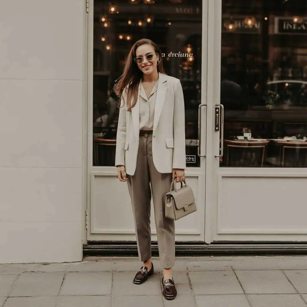 Opting for a lightweight knit blazer is a stylish and practical choice for those milder days when you want to look polished without feeling weighed down. The soft hues not only add a refreshing pop of color to your ensemble but also serve to brighten your overall appearance. Pairing the blazer with a classic tucked-in blouse gives a tailored feel that’s effortlessly chic, while tailored trousers complete the look with sophistication. Accessories like sleek sunglasses and a structured handbag elevate the outfit further, making it versatile for both daytime outings and casual meetings. This combination is undoubtedly for the modern woman who seeks balance between comfort and style!
