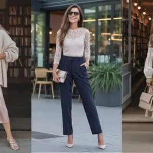 A fluid suit set redefines traditional tailoring by offering a fresh take with a light, airy silhouette. This ensemble is not only modern and chic but also allows for ease of movement, making it ideal for day-to-night transitions. Tucking in a soft white blouse under the tailored jacket enhances a polished appearance while maintaining a relaxed vibe. The lightweight fabric drapes beautifully, adding a touch of elegance without the stiffness associated with conventional suits. Pairing this look with structured accessories like a top-handle bag and clean kitten heels emphasizes a streamlined, sophisticated aesthetic, perfect for making a memorable impression at an outdoor market or a business meeting.