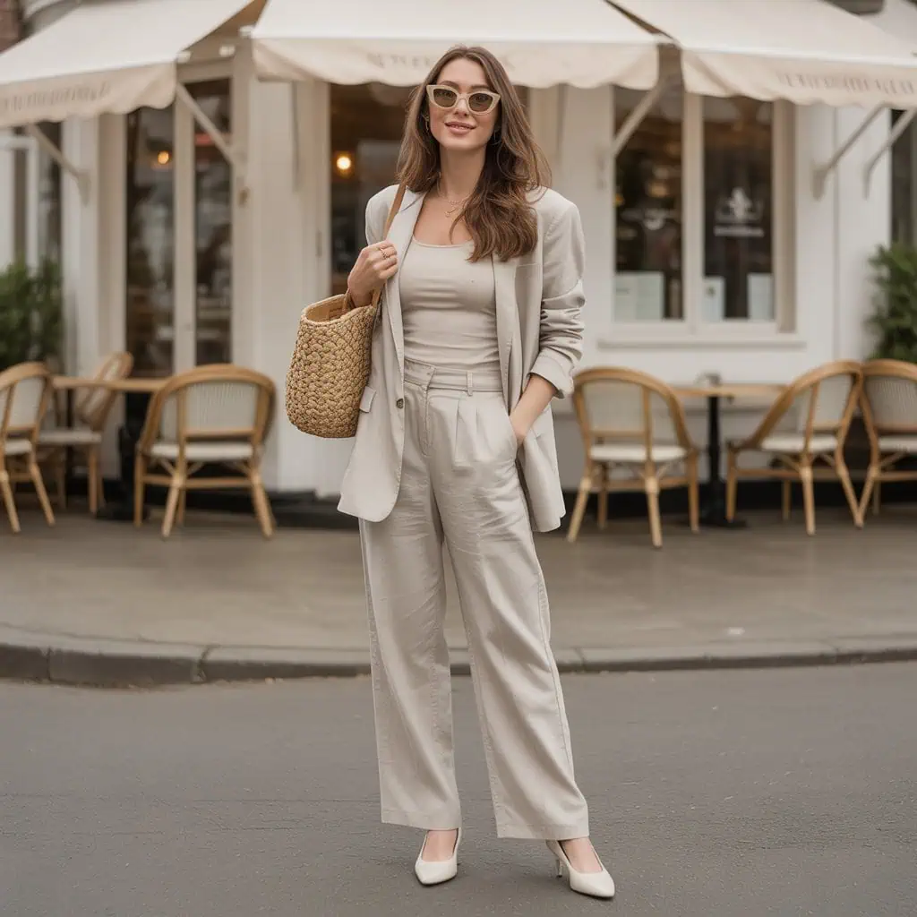 Embracing the relaxed elegance of a soft blazer and wide-leg trousers combo strikes the perfect balance between polished and playful. The ivory blazer adds a subtle brightness, while the fitted cream top creates a flattering, tailored look that seamlessly transitions into light beige wide-leg trousers, allowing for effortless movement. This style is perfect for a range of occasions, from casual brunches to informal office settings, while the chic white sneakers keep it grounded and youthful. The oversized sunglasses and structured tote further elevate the outfit, injecting a touch of sophistication that feels effortlessly chic.