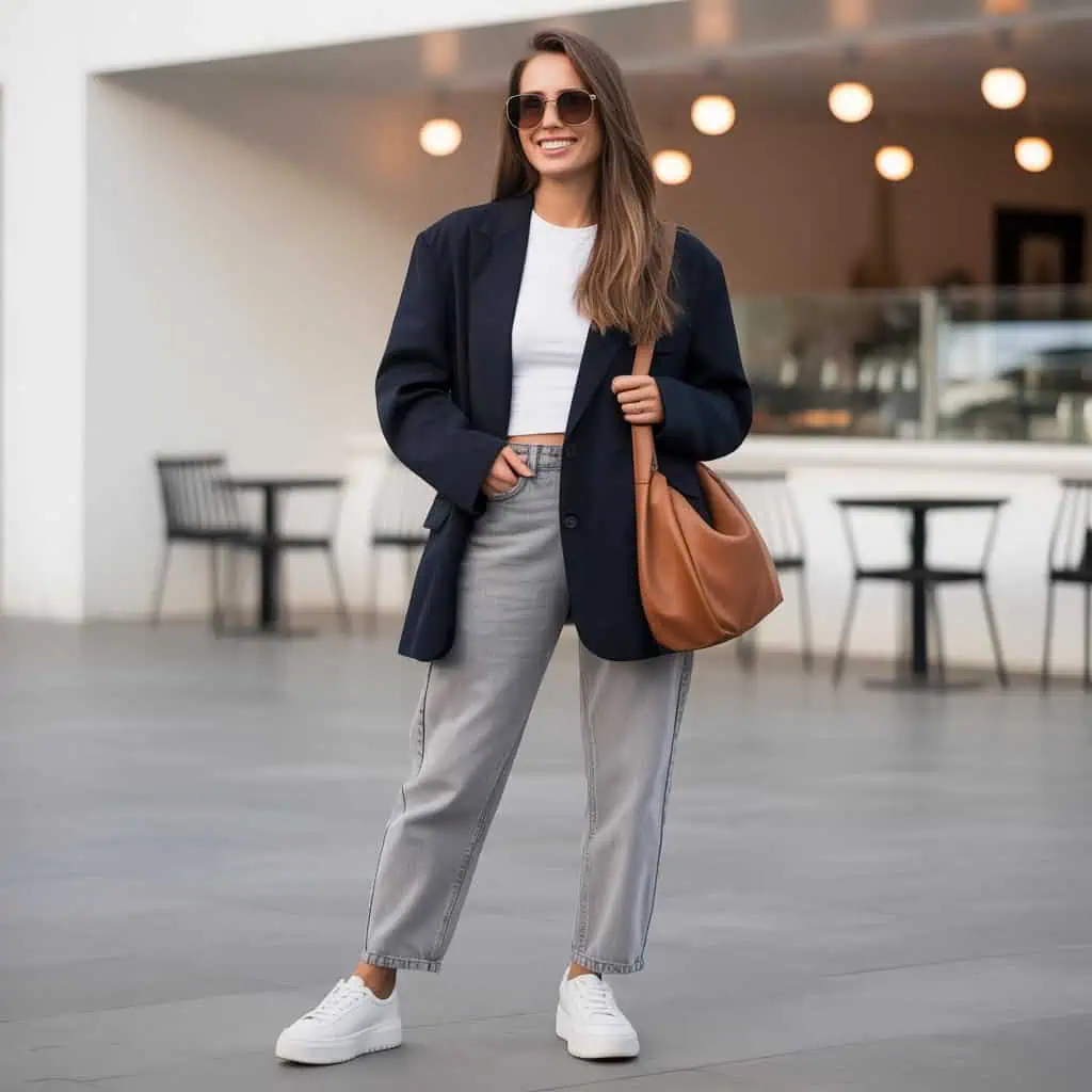 Sophisticated style hinges on balance, and overly distressed denim can tip that scale toward casual too easily. Instead, opt for a refined version that strikes a chord between casual comfort and polished elegance. Pairing lightly distressed denim with a cream blouse brings an effortless vibe, while polished leather loafers elevate the overall look. This combination allows you to play with textures, and the light wash against the soft hue of the blouse creates a fresh palette. Oversized sunglasses and a structured handbag finish the ensemble with a chic touch, making you ready for any dinner atmosphere while still exuding sophisticated poise.
