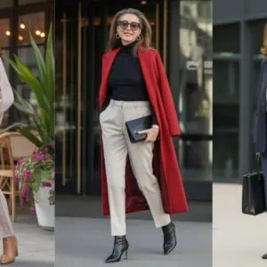 This effortlessly chic combination strikes the perfect balance between sophistication and comfort. The fitted sage-green turtleneck adds a sleek silhouette while the soft brown suede pants create a rich texture that complements any skin tone. The choice of cream slingbacks with a low kitten heel elevates the whole look without sacrificing comfort, allowing for all-day wear. Oversized sunglasses and minimal gold jewelry lend an air of glam, effortlessly transforming a daytime outfit into a refined ensemble. Together, these elements create a casual yet polished style that’s both Instagram-ready and ideal for everyday outings.