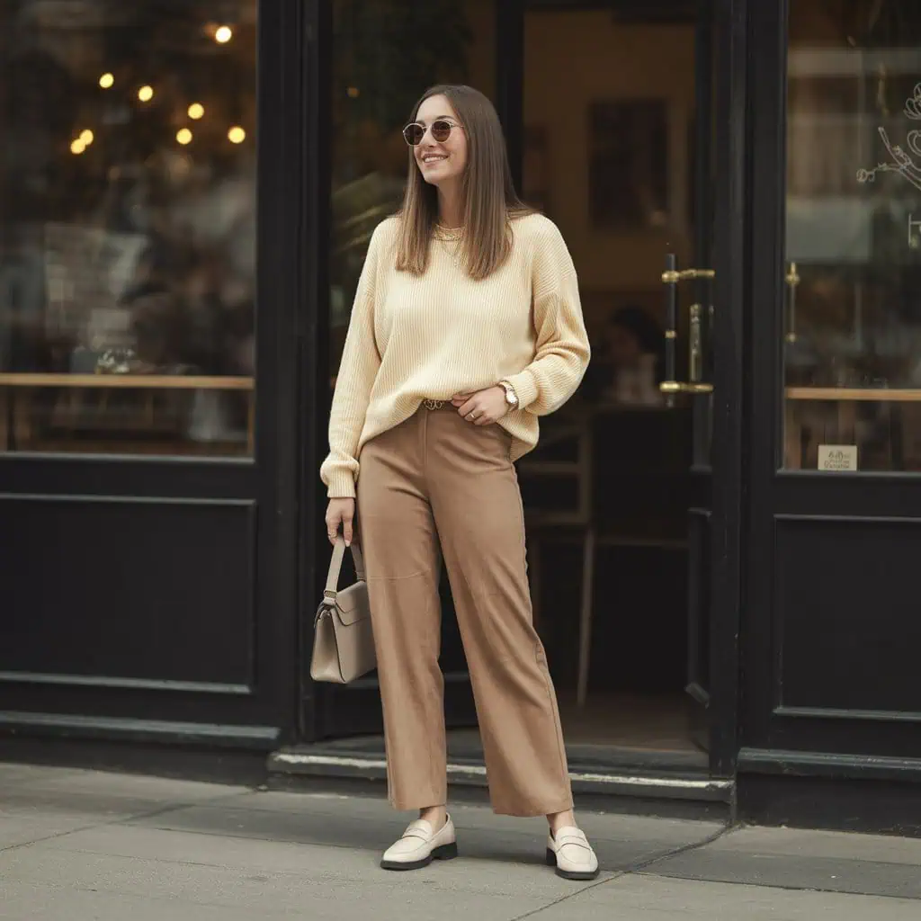 Pairing suede pants with a fine knit sweater effortlessly blends comfort with sophistication. The lightweight knit creates an inviting layer that is perfect for transitional weather, while tucking it into tailored camel suede enhances the silhouette, creating a polished yet relaxed vibe. The beige leather loafers introduce a touch of elegance with their low stacked heel, making them ideal for day-long wear without sacrificing style. Complementing the look with oversized sunglasses and delicate gold jewelry adds that final dash of chic, making it perfect for brunch or a casual meeting, all while exuding effortless flair.
