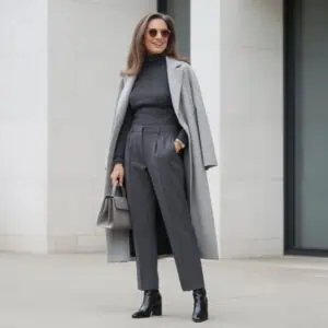 A monochrome ivory ensemble not only exudes sophistication but also serves as a canvas for your unique style. The gentle tones of the ivory turtleneck tucked into cream-wide leg trousers create a seamless, elongated silhouette that flatters your figure at any age. By breaking the monochrome look with a slightly deeper shade of cream, you add dimension without overwhelming the palette. The choice of beige suede ankle boots elevates the outfit while keeping it soft and approachable. Oversized sunglasses and a structured taupe handbag introduce chic elements that bring balance to the outfit and let your personality shine through. This combination speaks volumes about confidence and style, making it perfect for a memorable date night.