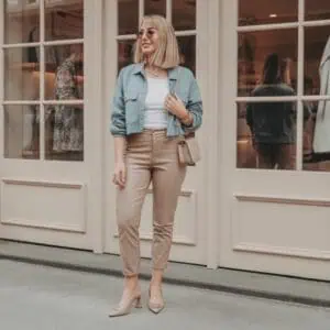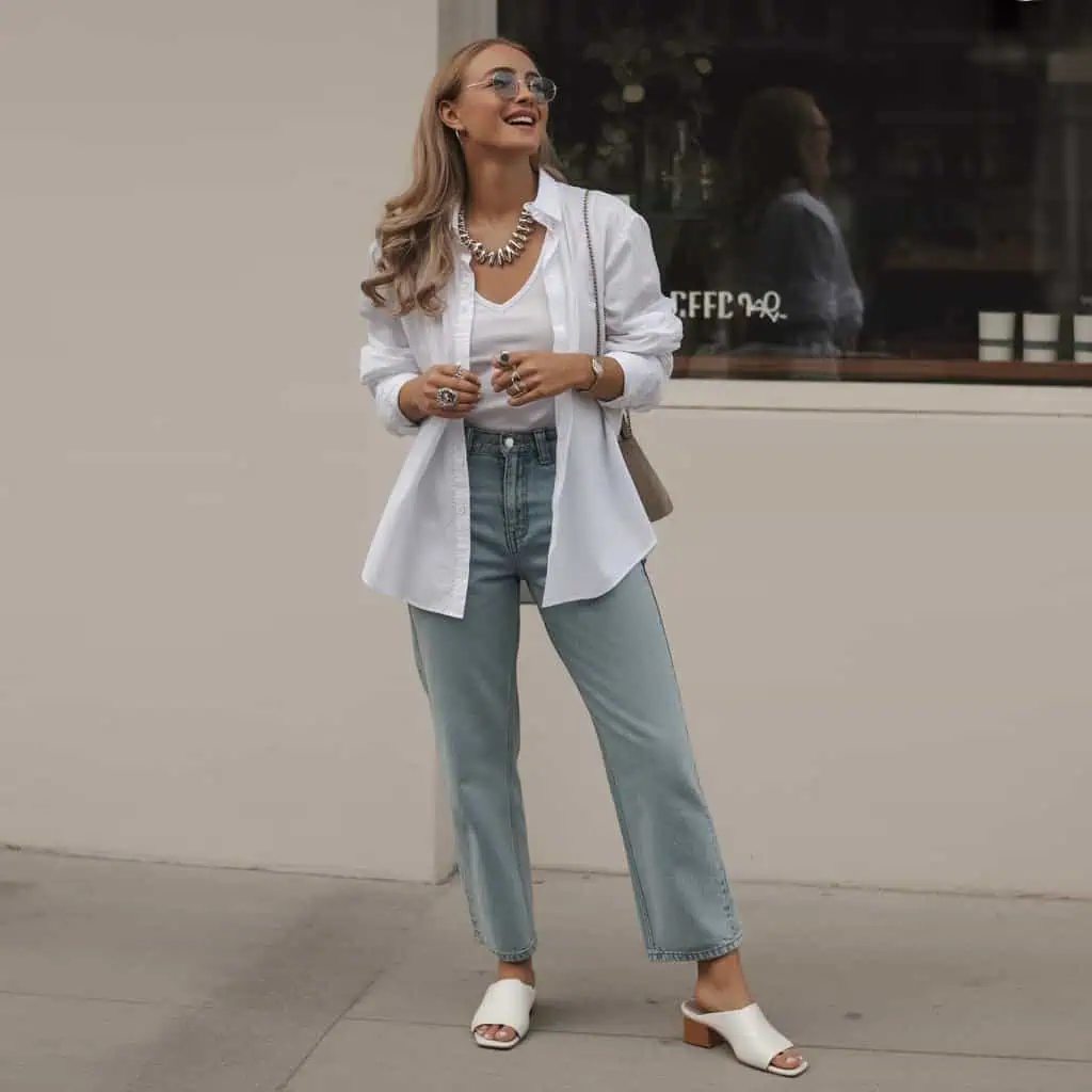 There’s something undeniably refreshing about combining a bold statement necklace with an open-collared shirt layered over a T-shirt This pairing invites a mix of structure and casual elegance. The crisp white shirt introduces a tailored feel, made even more interesting with the layered textures that a turtleneck provides. Straight-leg denim trousers ground the look, offering a touch of modernity. The white slip-on mules add ease, making the entire outfit effortlessly chic for any daytime adventure. When topped off with delicate rings and a crossbody bag, the bold necklace becomes a focal point, showcasing your knack for layering and ability to turn a casual ensemble into a statement of personal flair.