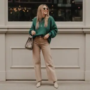 The combination of a cozy turtleneck and wide-leg trousers strikes the perfect balance between warmth and elegance, making it an ideal choice for the holiday season. The turtleneck provides a snug, refined feel, while the wide-leg silhouette adds a touch of relaxed sophistication. Opting for soft beige tones creates a monochromatic palette that is not only visually appealing but also elongates the figure. Pairing this look with cognac ankle boots adds a chic contrast, grounding the outfit without overwhelming it. Accessories like statement sunglasses and gold earrings add a hint of flair, completing the ensemble with effortless style.