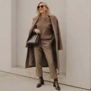 Opting for well-crafted pieces that stand the test of time is key to smart fashion investment. The oversized trench coat layered over a soft knit sweater not only provides warmth but also makes a bold style statement. Tailored black trousers elevate the look, creating a seamless silhouette that exudes professionalism yet retains a cozy feel. The beige suede ankle boots with block heels are not only stylish but also practical for all-day wear. A taupe leather tote bag provides ample space while contributing to the outfit’s luxurious aesthetic. With a few thoughtful choices, you can build a wardrobe that feels timeless and chic, steering clear of fleeting trends.