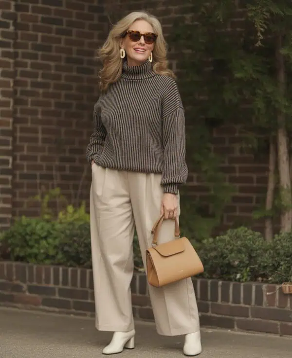 When drama meets refinement, you get a structured maxi coat paired with neutral knee-high boots. The coat’s long lines create an elongating effect, and the boots add just the right amount of height and polish.