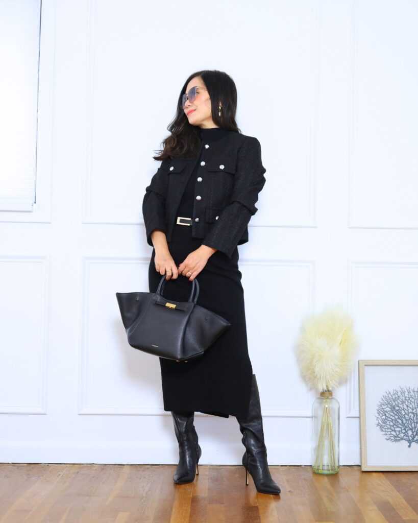 Monochrome outfits are like a cheat code for petites. Wearing all one color from head to toe creates a clean, unbroken line that instantly elongates your body. I went with all black here—partly because it’s chic, but also because it really works. The skinny belt with gold detail adds just enough structure and polish, and the knee-high boots (also black!) keep that vertical line going strong.