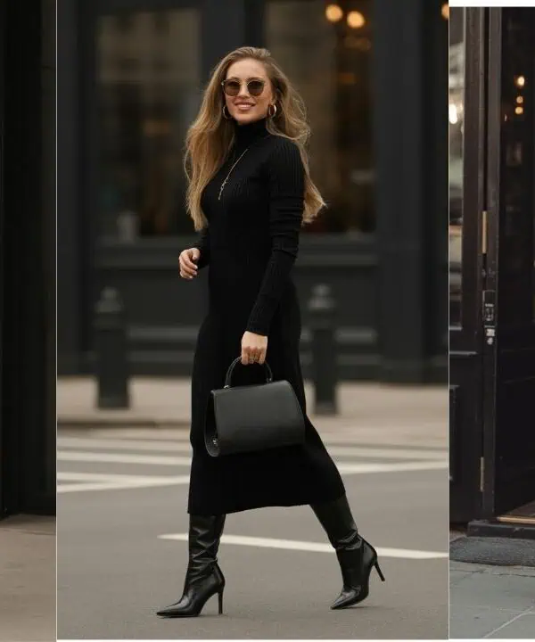 Opting for an all-black ensemble is a tried-and-true technique for achieving a sleek and polished look! Black is universally flattering and has an excellent slimming effect due to its ability to absorb light and smooth out bulges.