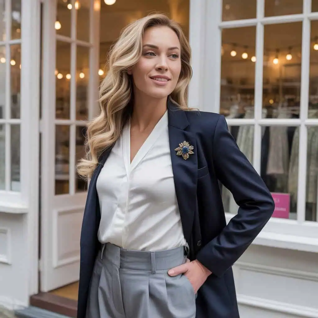 Elevate any ensemble effortlessly with a statement brooch, a piece that speaks volumes about your style savvy. Nestled on a tailored navy blazer, it serves as the perfect focal point, drawing the eye while adding a dash of personality to your look. A crisp white blouse and high-waisted gray trousers provide a chic canvas, allowing the brooch to shine without competing for attention. This accessory enhances your elegance, showcasing that you’re not afraid to opt for something bold and distinctive. Plus, it’s a conversation starter, ensuring that compliments come your way as you navigate through your day.