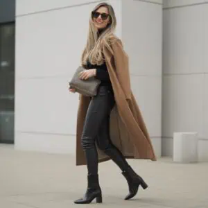 A long cardigan draped over your favorite top and fitted black leggings is the ultimate cozy yet polished combination for winter. The cardigan adds layers without overwhelming your frame, and its length provides a perfect contrast to the form-fitting leggings. By sticking with a monochromatic color palette, like a beige cardigan against your black leggings, you create a streamlined look that elongates your figure. Accessorizing with sleek ankle boots and modern square sunglasses adds a fresh, contemporary touch, making this outfit just right for everything from brunch dates to casual meet-ups, where style meets comfort.