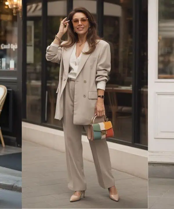 Shiny satin trousers offer an exceptional blend of elegance and comfort, making them perfect for women over 60 who still want to exude sophistication. The soft sheen of satin catches the light beautifully, drawing attention to the wearer without being overpowering. When paired with a classic blouse, the ensemble strikes a perfect balance between modern and timeless styles. Chic low block heels not only elevate the look but ensure comfort, allowing for prolonged wear. Layering pearl bracelets adds a touch of refinement, making this outfit suitable for any occasion—from casual brunches to more formal gatherings—while oversized sunglasses lend a dash of glamour.