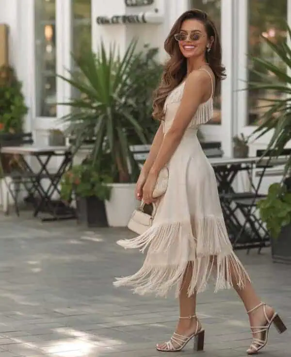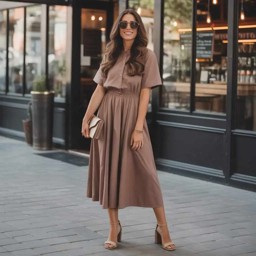 Crafting a monochrome ensemble is a powerful tool in the art of looking expensive. By dressing head-to-toe in varying shades of brown, you create a sophisticated, cohesive look that exudes luxury. The dress shapes your silhouette, while the knee-length length adds a polished touch, harmonizing beautifully with brown heels. Accessories play a pivotal role here; a matching clutch and round sunglasses elevate the entire outfit, making it appear curated and put-together. Monochrome outfits create an aura of confidence and intentionality, showing that you understand the subtleties of fashion without relying on flashy colors or prints.