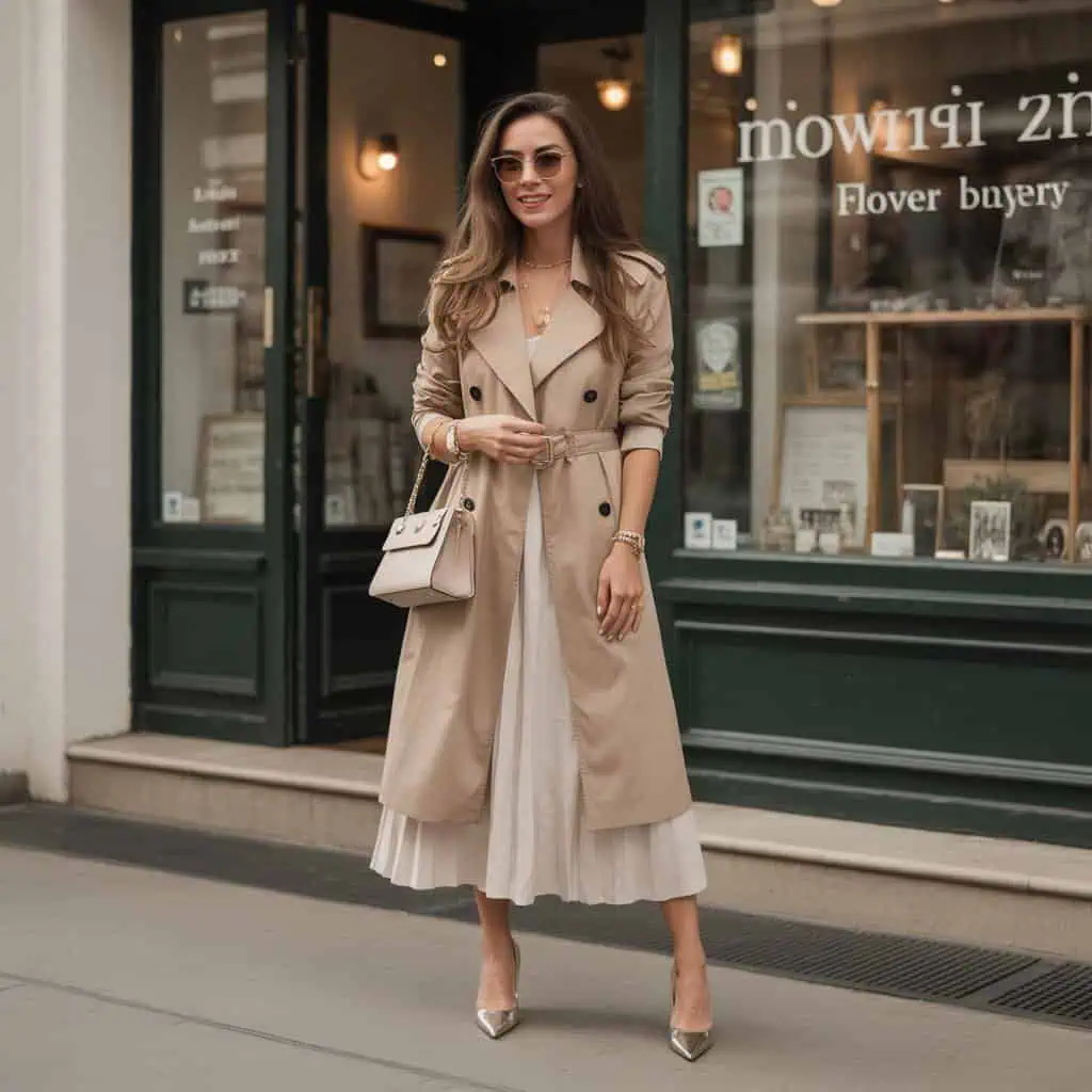Nothing speaks to timeless sophistication quite like a belted trench coat layered over a flowy midi skirt. This pairing marries classic tailoring with soft, feminine flair, making it an ideal choice for transitional weather. The trench coat adds structure and personality, while the flowy skirt introduces movement and grace to the outfit. Opting for pointed-toe heels not only elevates your height but also refines the look. Accessories, like a chic handbag and subtle gold jewelry, maintain an air of elegance without overshadowing the ensemble. This outfit embodies a modern take on classic women’s wear, perfect for any stylish outing.