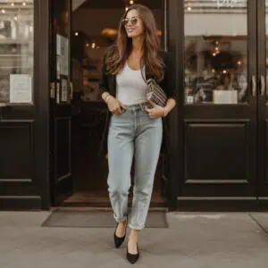 Embracing comfort without sacrificing style, this ensemble is a go-to for any journey. The longline cardigan delivers a soft layer that’s cozy yet refined, perfect for transitioning through various temperatures in an airport. Coupled with a fitted tank, it highlights your silhouette without feeling too constricting. Relaxed, high-waisted pants create a flowy silhouette that allows for maximum comfort during travel. Completing this look with chic white flats ensures ease while maintaining an air of sophistication. Minimal accessories keep the overall appearance effortless and chic, making this a polished choice.