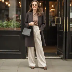 A camel coat featuring oversized lapels brings a captivating touch to your outerwear collection. The boldness of these lapels draws the eye up, beautifully framing the face and adding dimension to the neckline. Layering it over a simple white blouse allows the coat to take center stage while maintaining a clean aesthetic. Pairing with straight-cut charcoal trousers keeps the look polished yet comfortably relaxed. The choice of dark brown loafers not only grounds the ensemble but also adds subtle texture. Enhance the outfit with delicate accents like a gold chain necklace and chic brown sunglasses, lending a modern flair. This combination allows you to radiate confidence while ensuring your style remains effortlessly sophisticated.