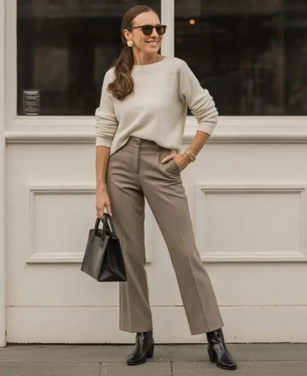 Boxy quilted jackets are an excellent way to embrace both comfort and contemporary style, perfectly suited for women in their 70s. This cut, especially when done in dark taupe, offers an effortlessly chic vibe while providing warmth without adding bulk. Pairing it with straight-leg trousers and a simple beige turtleneck creates a refined aesthetic that feels polished yet relaxed. Accessorizing with small gold hoops and a camel satchel bag adds understated elegance, while gradient sunglasses blend practicality with style. It’s a fantastic choice for those who appreciate minimalism with a touch of modern flair, highlighting that sophistication knows no age.