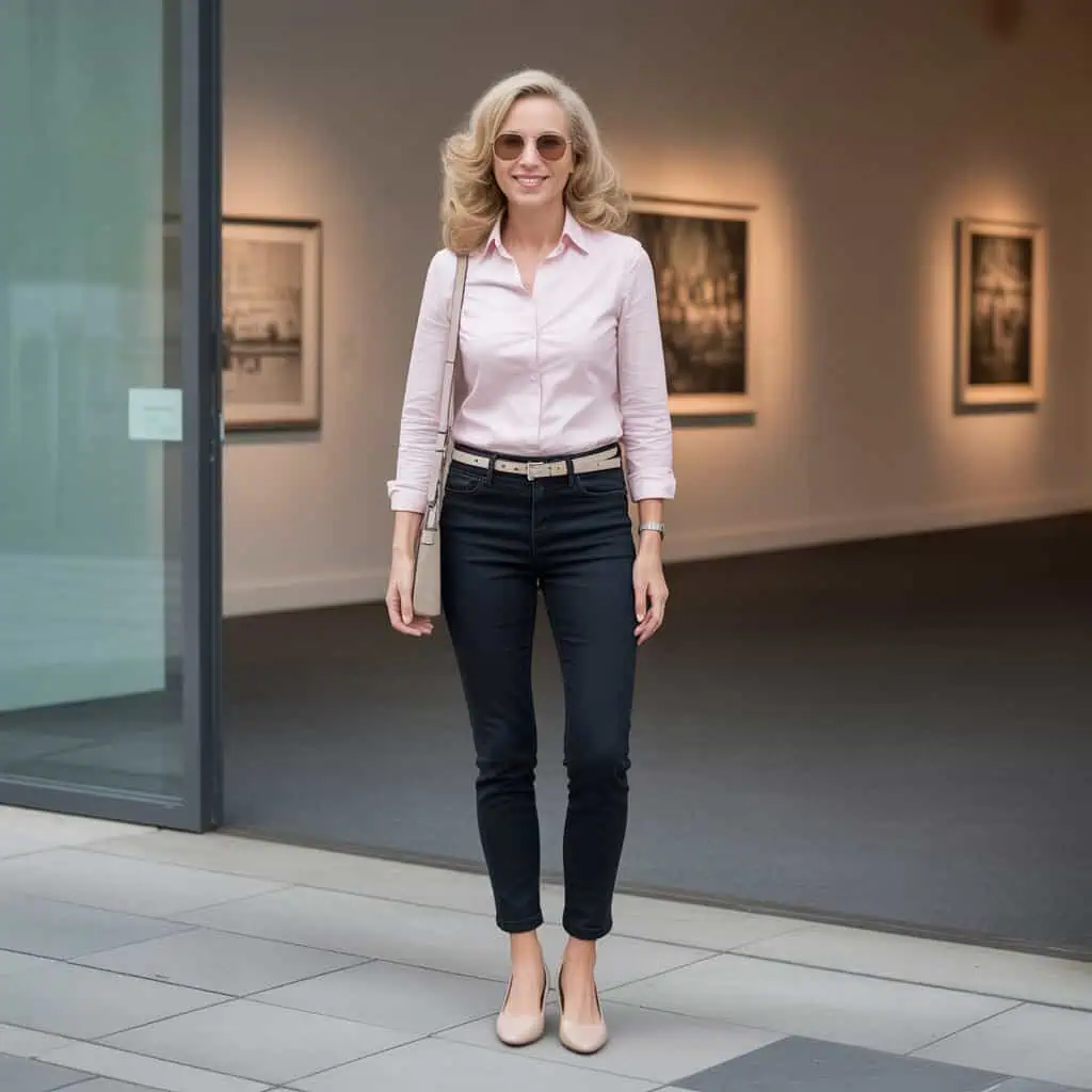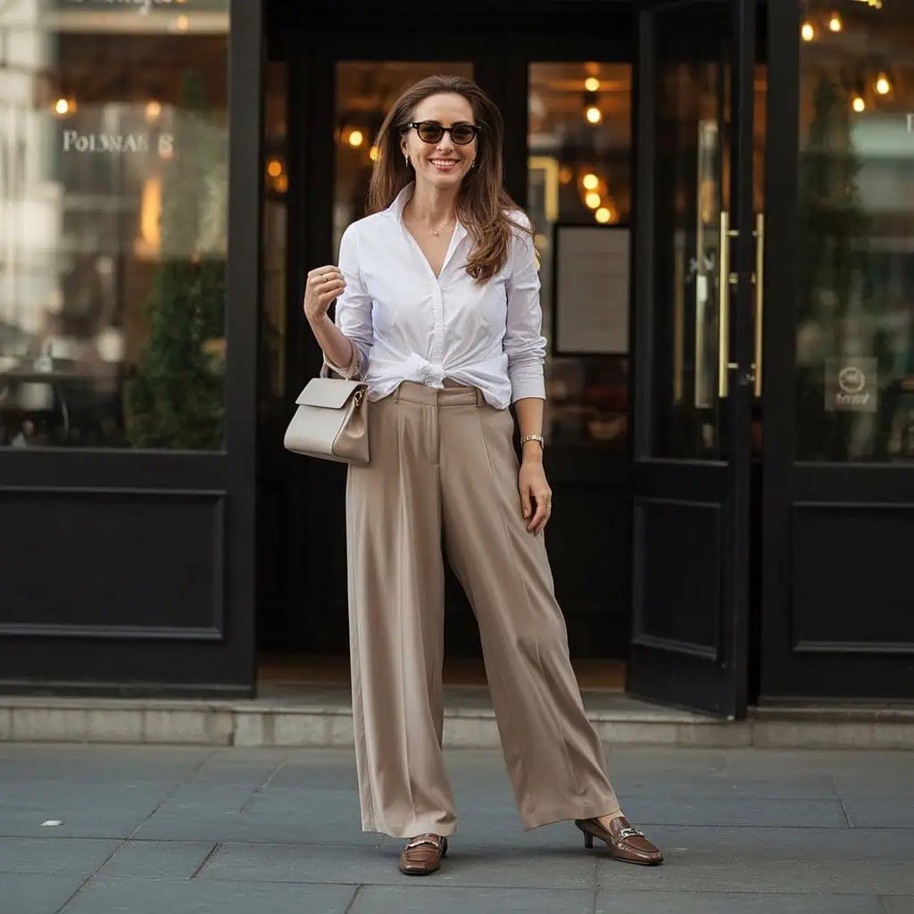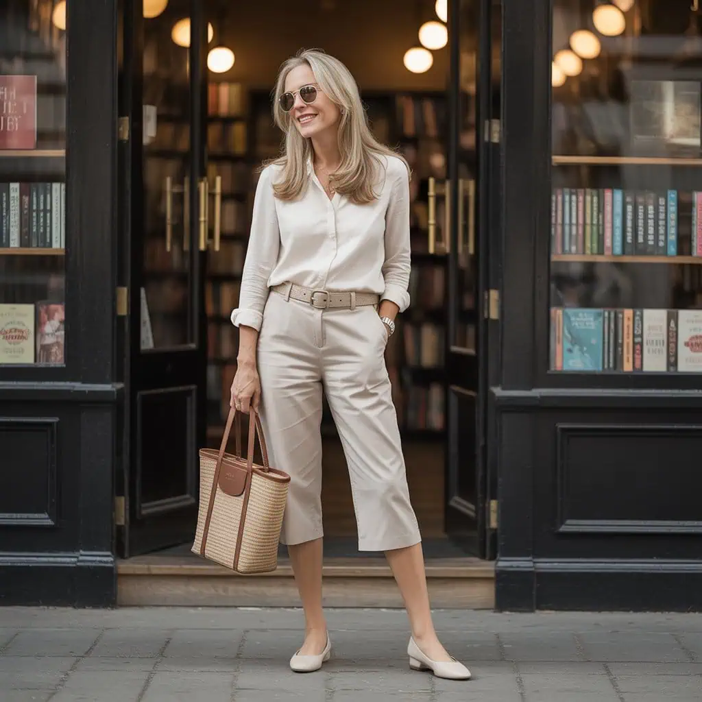 Capri pants often cut at an unflattering length, which can disrupt proportion. Instead, high-waisted tailored trousers that end just above the ankle offer a lengthening effect, creating a sleek silhouette. Tucking in an elegant white blouse adds polish, while relaxed sneakers keep the vibe from feeling too formal. This effortless look is versatile enough for both casual outings and slightly dressier occasions, allowing you to maintain comfort without surrendering style. The combination not only fosters confidence but highlights your unique flair, making it a perfect classic with a modern twist.