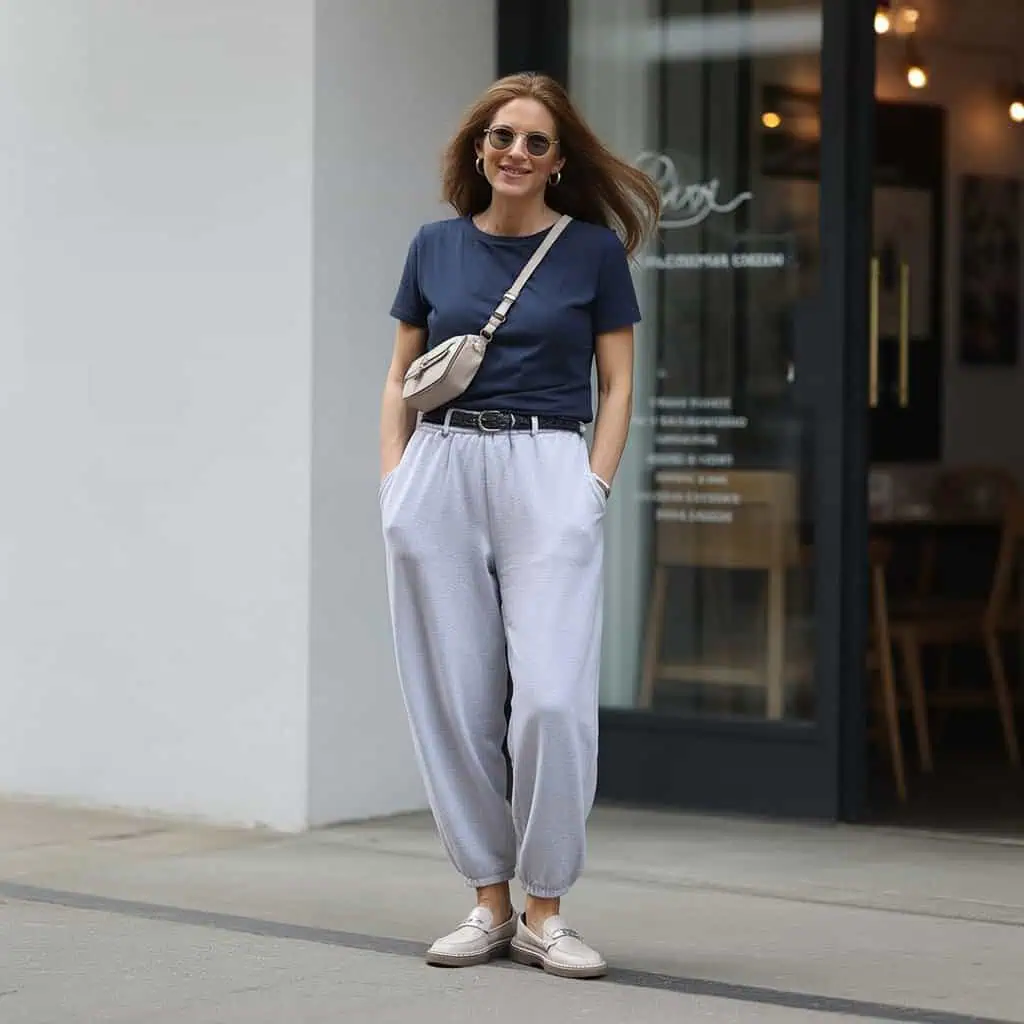 While comfort is important, baggy sweatpants can often veer into frumpy territory when worn outside the home. Consider swapping these out for fitted chinos. Tailored beige chinos offer a sophisticated, polished vibe that enhances your silhouette while providing ease of movement. Pair them with a classic navy blue tee to create a timeless look that feels effortlessly chic. Finish off with white sneakers for that stylish causal touch, perfect for errands or coffee dates. This combination not only elevates your outfit but also keeps you looking put-together while ensuring comfort is never sacrificed.