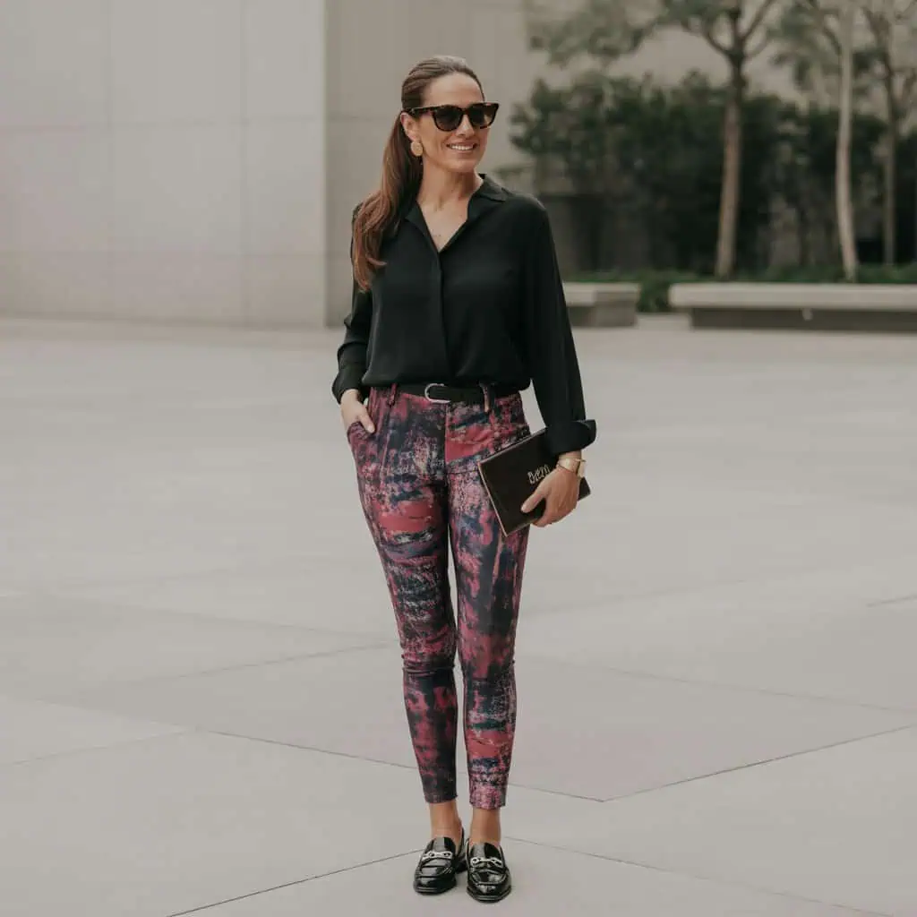 While bold printed leggings might seem alluring, they can easily dominate an outfit instead of enhancing it. Opting for tailored cropped pants allows for versatile styling that can be both chic and contemporary. The sleek waterfall cardigan elegantly drapes over a simple black top, giving an effortlessly put-together appearance that elevates a casual look. Completing the outfit with trendy white sneakers ensures comfort without sacrificing flair. This ensemble allows for self-expression while remaining refined, perfect for those who appreciate distinct yet sophisticated outfits.