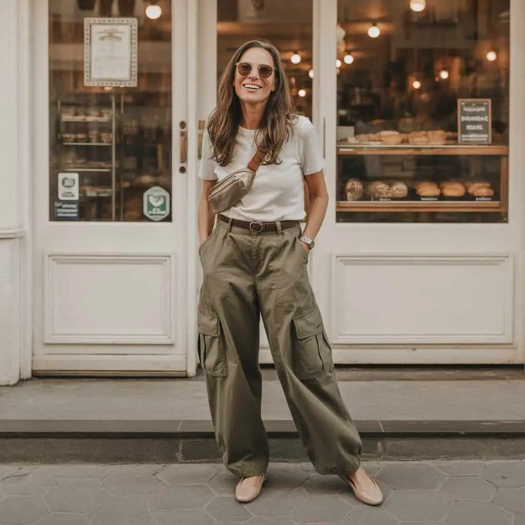 Bulkier cargo pants with oversized pockets can easily overwhelm the frame, making them a less favorable choice for a refined look. Instead, choosing a streamlined straight-leg silhouette creates a more elongated appearance, especially when paired with a fitted top. The classic navy blue blouse adds an elevated touch while maintaining a casual vibe that works wonderfully for daytime outings. Completing this outfit with chic white sneakers keeps it fresh and comfortable without sacrificing style. This combination is ideal for showcasing your personal style while ensuring you feel both confident and chic.