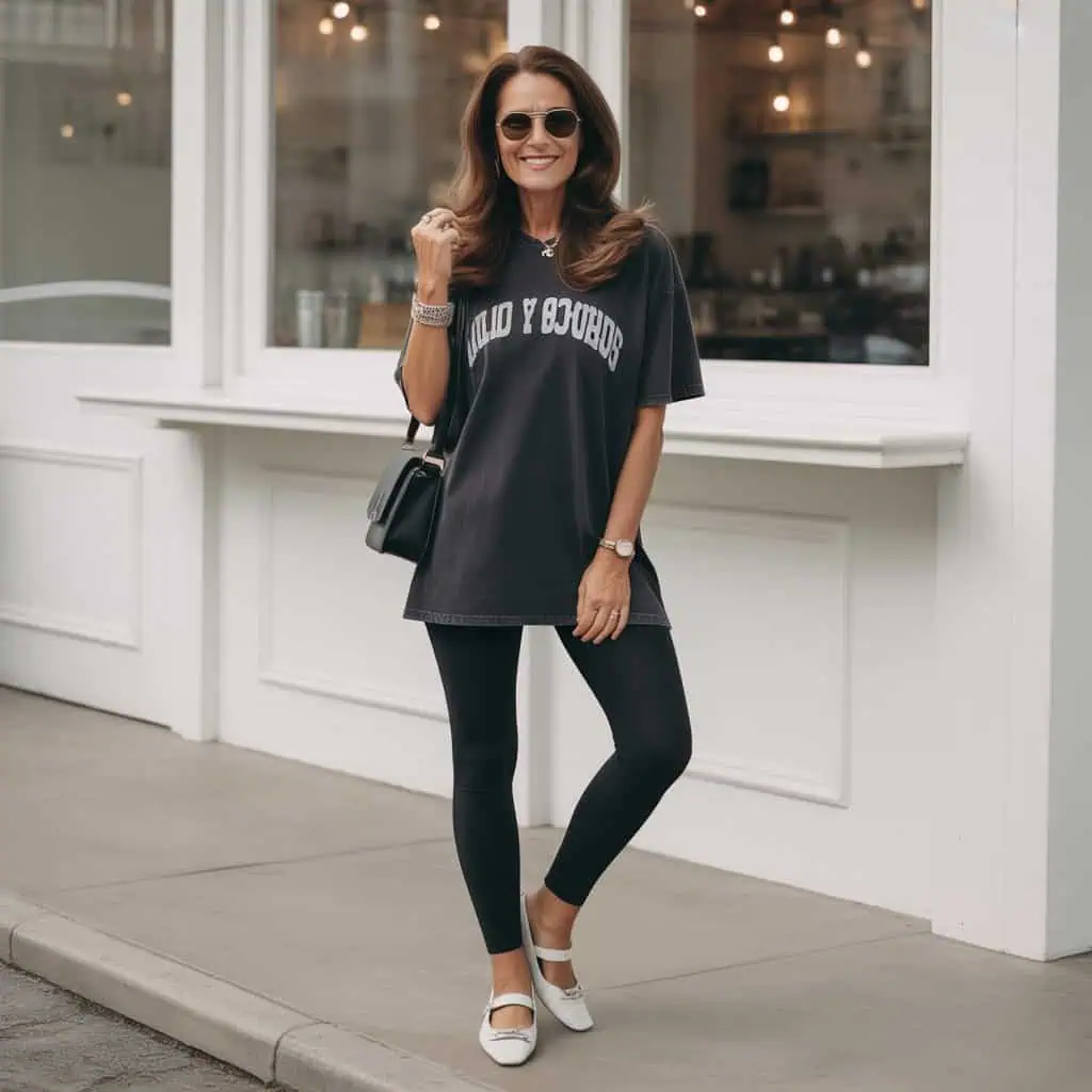 Embracing comfort and style is key, but this oversized graphic tee and leggings combo often misses the mark. While the intention is to channel a laid-back vibe, the overabundance of fabric can obscure your silhouette, making it hard to showcase your shape. For a more flattering fit, consider opting for a structured top or layering with a light cardigan that draws attention to your waistline. The addition of tailored trousers or flattering yoga pants can elevate the casualness while maintaining comfort. The key is to balance ease with elegance to keep your look chic yet age-appropriate.