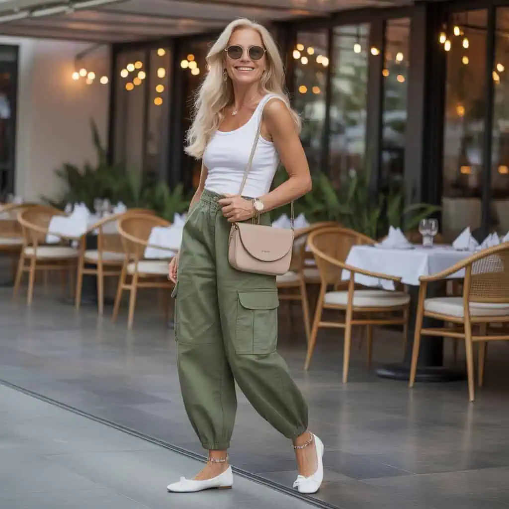 Cargo pants paired with a cropped tank may sound like a youthful, trendy combination, but it can easily shift towards a juvenile vibe if you’re not careful. The cropped style can highlight areas you’d prefer to downplay, while the bulk of cargo pants may not create the flattering silhouette you desire. Instead, consider high-waisted trousers with a fitted or billowy top—these options maintain a comfortable style while celebrating your shape. This can elevate your outfit’s sophistication without sacrificing comfort, keeping you stylish yet age-appropriate.