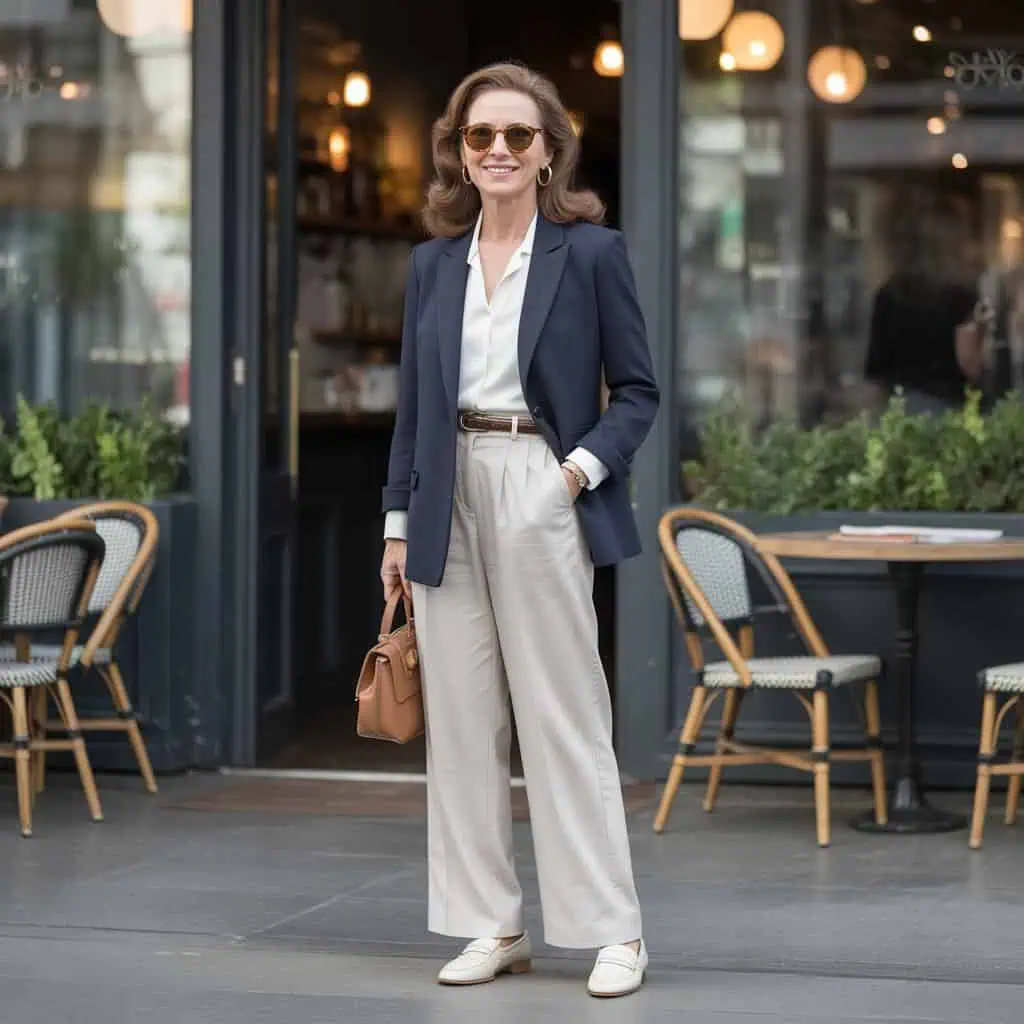 A tailored blazer elevates any outfit by adding structure and polish, especially when paired with wide-leg belted trousers. This combination flatters the silhouette, offering a chic contrast to the softness of a flowing pant. The blazer’s clean lines create a modern look that showcases confidence. Opting for loafers keeps comfort in mind while ensuring one remains stylish; they’re a timeless classic that pairs effortlessly with tailored pieces. Accessorize with a minimalist handbag and hoop earrings to complement the outfit without overpowering it. The final touch? Tortoise shell sunglasses that bridge the gap between classic and contemporary, making for a perfect ensemble that radiates confidence and grace.