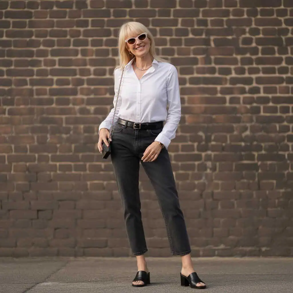 A crisp button-down shirt brings timeless elegance, while its tailored fit provides a flattering shape that looks polished without feeling stuffy. Tucking it into straight-leg belted jeans offers versatility; the dark wash balances out the starkness of the shirt, creating a seamless transition between smart and casual. Block-heel mules provide both comfort and a touch of sophistication, elevating the whole outfit while remaining practical for all-day wear. The addition of a delicate chain necklace draws attention to the neckline, and cat-eye sunglasses bring a playful flair that softens the look. This combination creates an effortlessly chic appearance, perfect for any occasion.