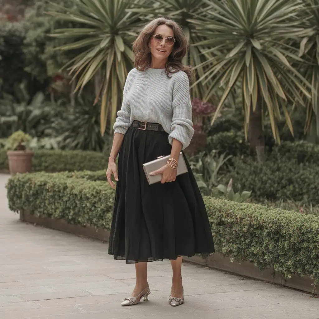 A lightweight knit sweater is an essential piece that adds warmth and texture to any outfit without bulk. When tucked into a flowing midi skirt, it balances body proportions beautifully, creating a flattering silhouette. The addition of a waist belt emphasizes the waist, adding shape while keeping the look refined. Slingback flats are perfect for comfort, merging elegance with ease; they lend a subtle femininity that complements the flow of the skirt. Accessorize with a structured clutch and delicate gold bracelets for an understated yet sophisticated vibe, while round-frame sunglasses will add a touch of vintage charm, ensuring a polished yet relaxed style.