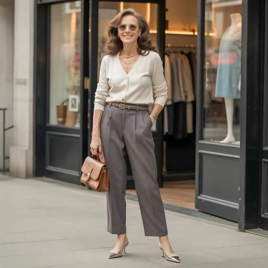 Transforming a structured cardigan into a top gives an unexpectedly modern twist to your ensemble. By fastening it and pairing it with tailored belted pants, you create a streamlined silhouette that feels both sophisticated and relaxed. The tailored pants add sharpness, while the cardigan introduces warmth and texture, bridging casual and chic effortlessly. Complement this look with slingback heels to add height without sacrificing comfort, making it perfect for prolonged wear. Layered necklaces and a leather satchel introduce subtle detail and functionality, perfect for those who value style without compromising on practicality.